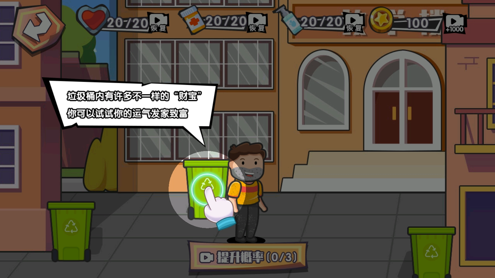 《我是流浪汉》是一款休闲模拟游戏。你被外星人掳到了一个完全陌生的世界,变得身无分文,只能以流浪汉的身份在城市边缘挣扎求生。就在这时,你意外发现了一条独特的致富途径——通过捡垃圾就能实现财富积累。现在,依靠你的双手在城市边缘闯荡,不放过任何一个垃圾桶,一步步走上人生巅峰,成为声名远扬的“垃圾大亨”吧!