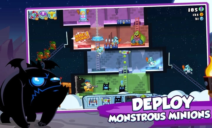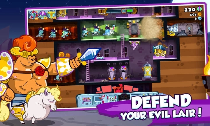 2、你可以通过解锁、升级并定制陷阱、部队和城堡,持续增强自身实力,进而成为终极邪恶天才。
