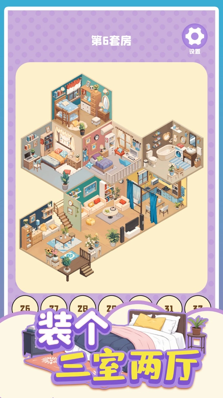 《装个三室两厅》是一款画风超萌的休闲装扮游戏,玩家需要把打包好的家具摆放进房间,装扮属于自己的小屋。游戏采用可爱的卡通画风,关卡内容十分丰富,能充分满足你的收纳与装扮需求。将一间空荡荡的房间打造成温馨漂亮的小家,从中收获满满的成就感,精心收纳客厅和卧室,快来试试挑战吧!