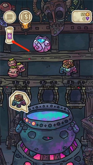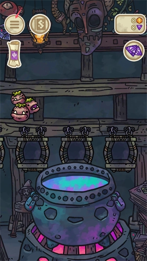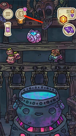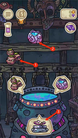 2、货架上陈列着原料,你可以拖动或点击其中两个原料,接着选择下方的搅拌图标,就能把它们添加到坩埚里进行炼制。