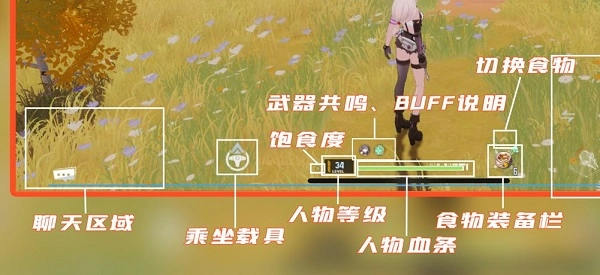 8.饱食度:点击小圆可打开饱食度食物栏,同时能查看当前自身的饱食度数值。饱食度的作用是在脱战状态下自动恢复生命值,恢复过程中会消耗饱食度,可将其理解为一种回血储备。一般来说,所有食物都能增加饱食度,不过用于提升耐力的食物除外。