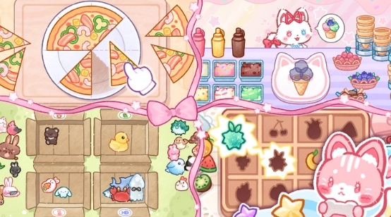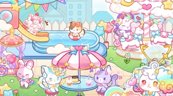 看,这就是游乐园!小猫们能在超好看的旋转木马上转圈圈,也能在游泳池里开心地嬉戏,还能在小舞台上表演,活脱脱像个大明星!这里还有家商店,在那儿你可以挑选超萌的小娃娃,以及精致的配饰和漂亮的衣裳!