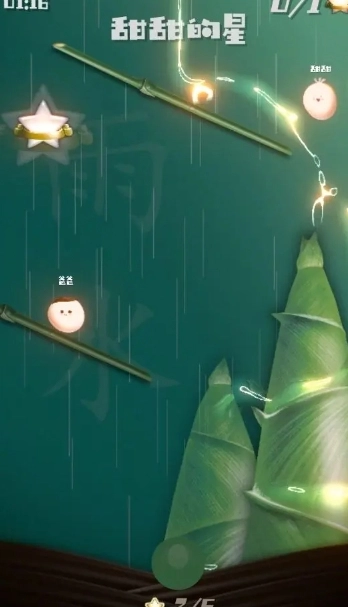 这一关中,要想顺利下落吃到星星,得先经过最上方竹竿的左侧,所以第一步得登上右边最高的笋尖位置。