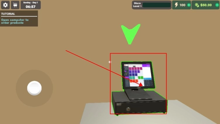 4.进入后打开右手边的门,在超市内点击电脑,购买商店待售的商品和货物架。