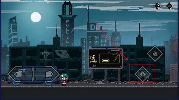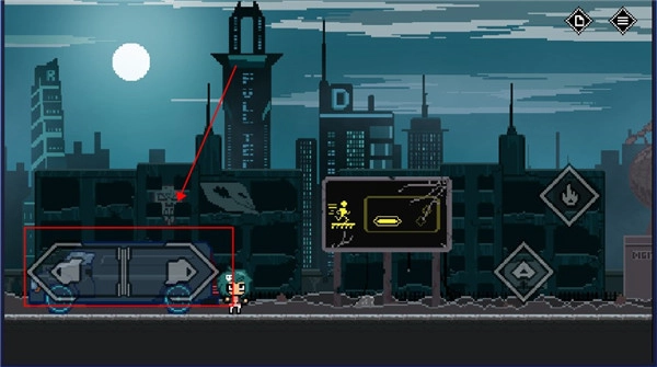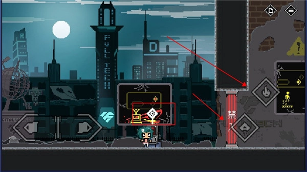 5、碰到禁止通行的大门时,不能直接靠近,得先找到开关并点击攻击;而这扇门则需要走到红框标注的位置,同时按下跳跃键和攻击键才能打开。