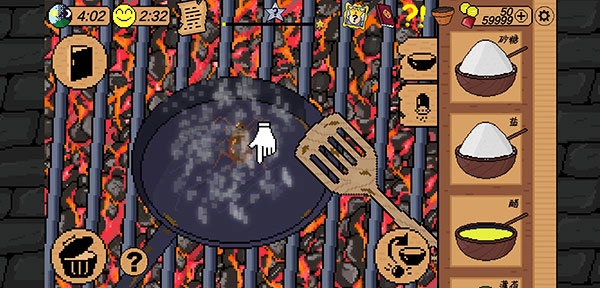6.点击锅启动烹饪程序,依据菜谱指示,先放入洋葱与蟑螂,接着添加3勺糖,然后拖动锅铲进行翻炒操作即可完成。