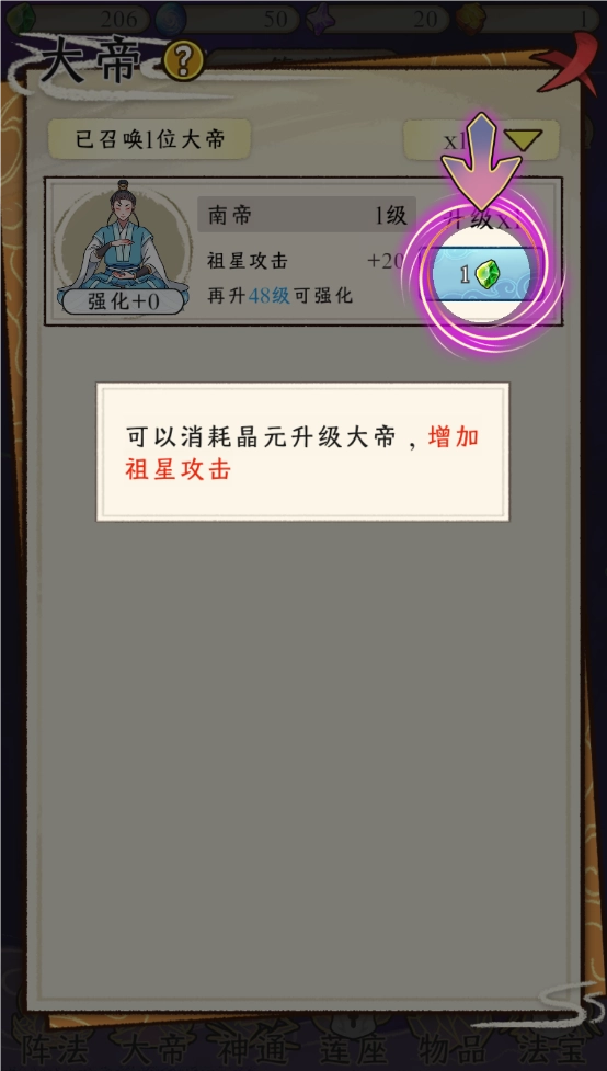 5、消耗晶元升级大帝,增加祖星攻击力;