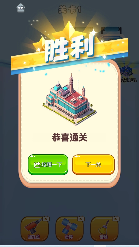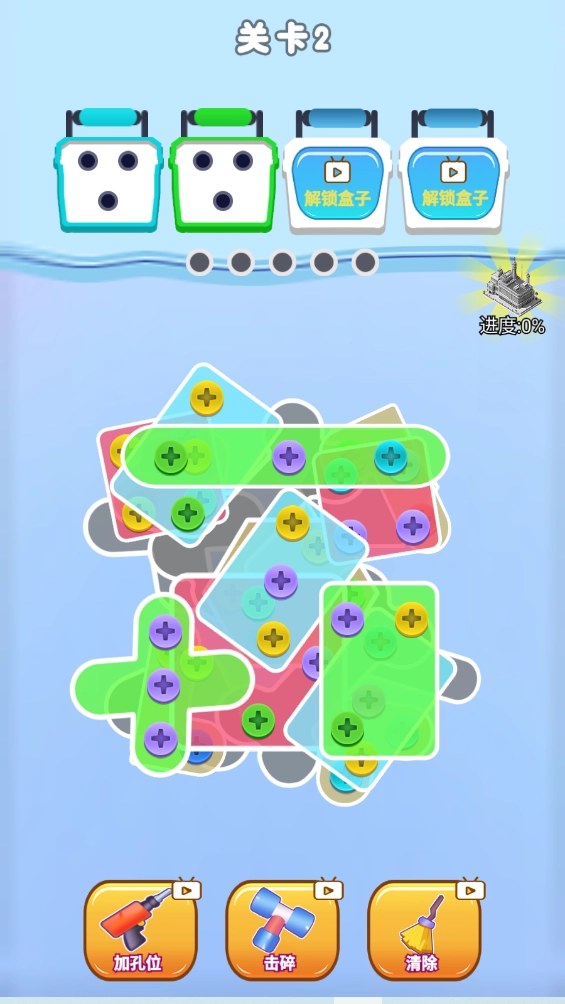 2.要是操作过程中卡住了,下面有一些道具可供使用,比如加孔位、击碎、清除等,不过使用这些道具需要观看视频。
