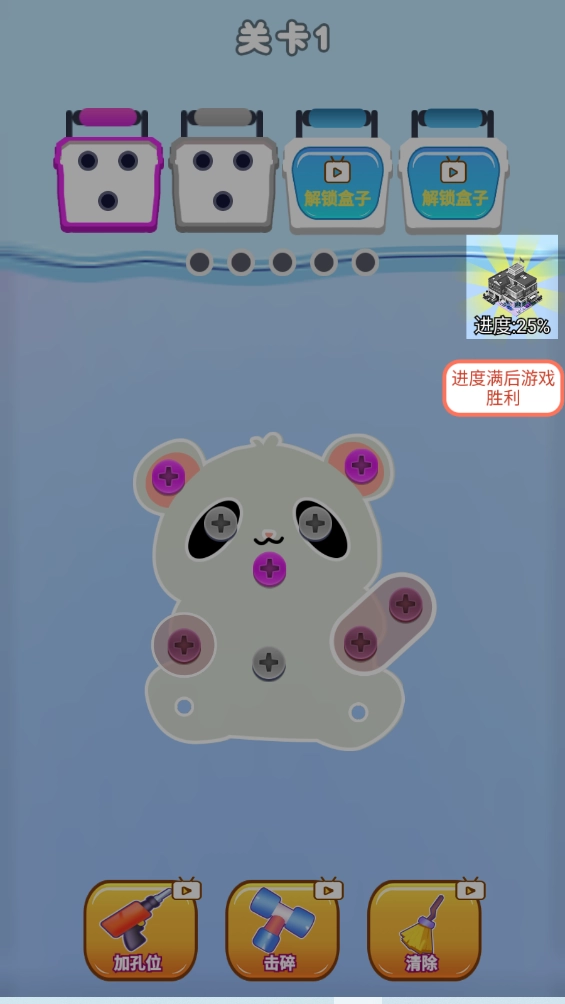 1.请注意,当槽位被填满时即意味着挑战失败,你需要将所有螺丝全部消除完毕,才能成功解锁下一关。