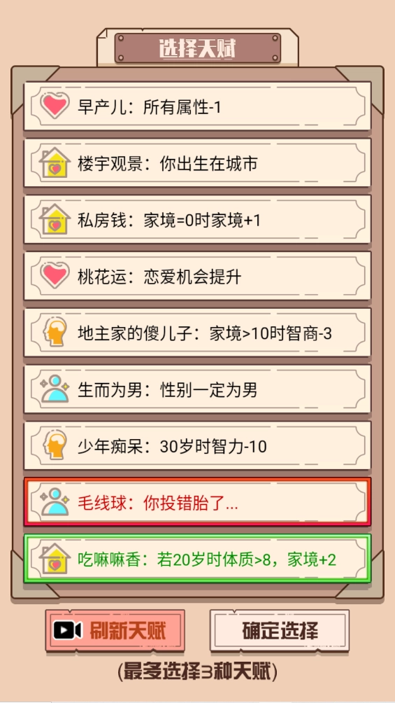 2.开局先选择天赋,最多只能选三种。