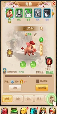 2、此外,升级宠物能够提升战力,当银两与宠物进阶丹数量充足时,就可以对宠物进行升级,从而为角色增加属性加成。