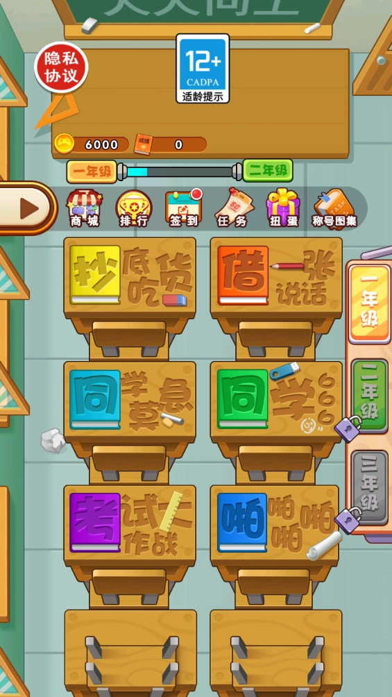 1、先进入页面,稍作等待加载,就能看到多种模式,像考试大作战、抄底吃货之类的,另外两个年级目前还未解锁。