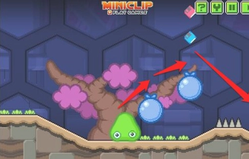 3、操控粘液跳到气球上,接着越过钉刺,下方是无法通过的!