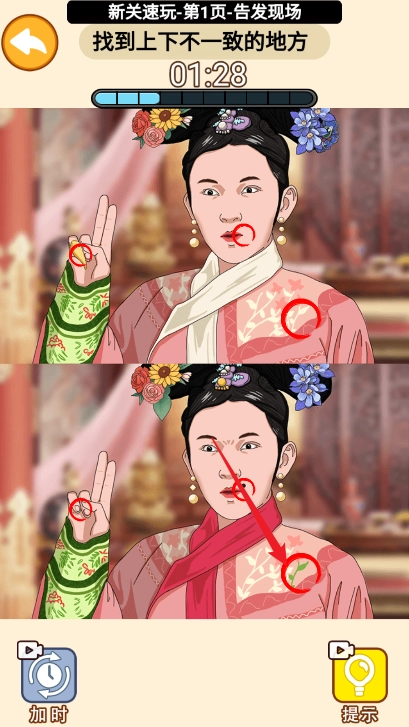 在经典的找不同玩法基础上增添了丰富的设置,为你带来别具一格的找不同体验,可自由开启闯关之旅。每一关都设有全新的挑战,需要你仔细观察场景中的每一处细节,找出所有的不同之处。若遇到任何难题,都能借助道具获得提示,从而在限定时间内找出所有不同点。