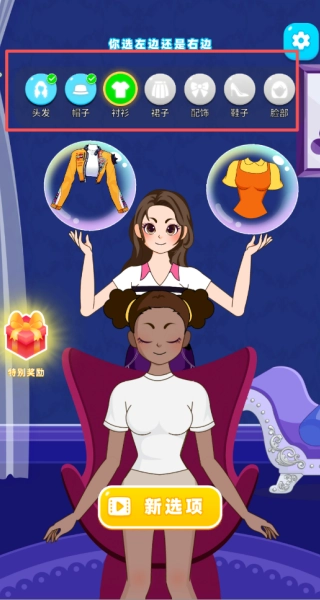 1、依据关卡主题从给定的服装里选择搭配,点击就能完成换装步骤。