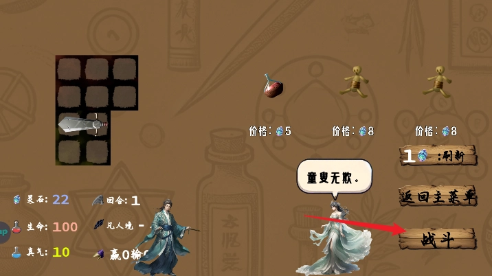 核心战斗全程自动,赢够10场就能取得最终胜利。左右游标可以拖拽来加速战斗进程,玩家只需在战前做好手动准备就行。灵石资源十分稀缺,必须合理规划使用。商店采用经典的肉鸽式选项设计,消耗灵石能购买武器与各类道具,部分道具存在组合搭配的可能性,还能依据它们的特性调整摆放位置,这个设定比单纯的收纳袋要更灵活实用一些。