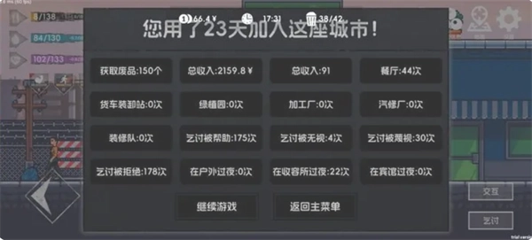 6、接下来的日子就是重复洗澡、打工、买东西、睡觉这些事。只要留意打工前饱食度保持在30以上,心情值维持在20以上(偶尔15也能应付,正常情况下每次打工心情会减8,额外事件很少有减5以上的情况),就不会出问题。就这样慢慢攒钱、提升技能,等攒到300多块,洗完澡后继续往左走,到地图最左边的办事处,每天交100块,连续交7天就能通关了(每天打两次工至少能赚50,再加上乞讨的收入,300多是比较保守的估计,肯定能达到通关条件)。