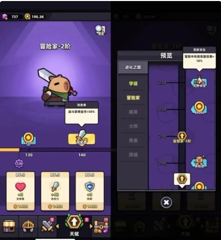 首先开放的是天赋系统。《CapybaraGo!》对天赋系统做了优化,设有生命值、攻击力、防御三个可升级的选项。每个阶段的升级次数是有限制的,当这三个属性都升到满级时,天赋阶段会得到提升,进而获取额外的属性加成。另外,每次升级天赋都会累计升级的总次数,当次数达到规定要求时,还能获得金币、时装、buff等额外奖励。值得注意的是,从预览内容能看出,《CapybaraGo!》的天赋系统深度不浅,后续所需的资源量也颇为可观。