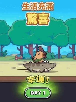 不过,在我看来,《CapybaraGo!》最突出的特点,还是“水豚”这个角色形象。有资料表明,卡皮巴拉是动物界新晋的顶流,它的名字源于英文capybara的谐音,中文名称为水豚。这种生活在南美洲的啮齿动物,在网络上已经成为了情绪稳定的象征——它们松弛自在、与世无争,情绪状态仿佛比人类领先了三十年。无论是泡澡、睡大觉,还是被其他动物踩在身上,水豚都没什么明显反应。虽然这些广为人知的场景多少受到饲养环境中人为因素的影响,但水豚本身确实具备一些从人类视角来看能显得淡定、松弛的特质。