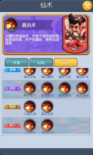 技能说明-真炎术:这是一种火属性的弹道仙术,能对第一个命中的怪物造成伤害,随后引发爆炸,并且带有击退效果。