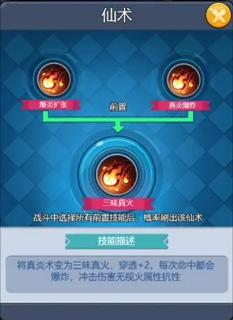 天火诛邪(入门):真炎术每命中12次,便会同步释放1波齐射5的真炎弹。