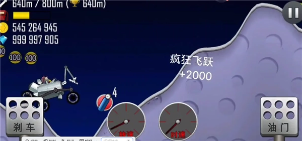 在月球地图上用初始吉普车反复挑战,借助低重力环境完成多次飞跃,每飞跃一秒能拿到25个金币。