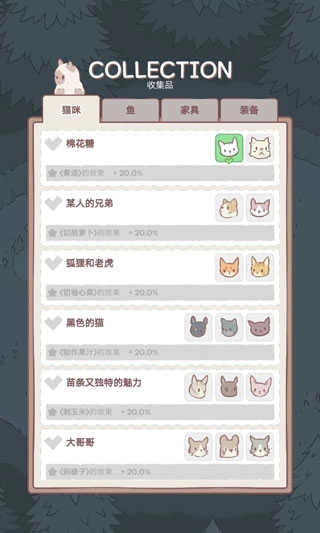 6、在收集图鉴中,你可以查看已收集到的猫咪品种、鱼类图鉴、家居摆设以及装饰配件。