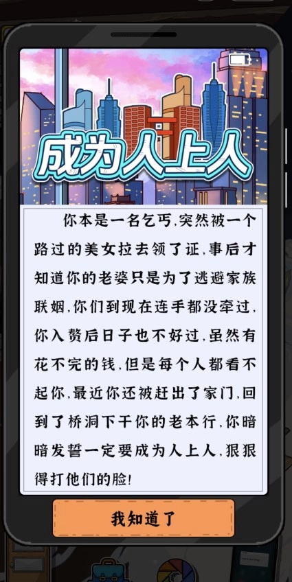 成为人上人是一场逆袭之旅,故事里你本是乞丐,意外被富家千金拉去结婚,需要通过逆袭让他人刮目相看。选择你的逆袭方式,通过赚钱完成蜕变——可以体验多种小游戏来达成赚钱目标,感兴趣的小伙伴不妨来试试!