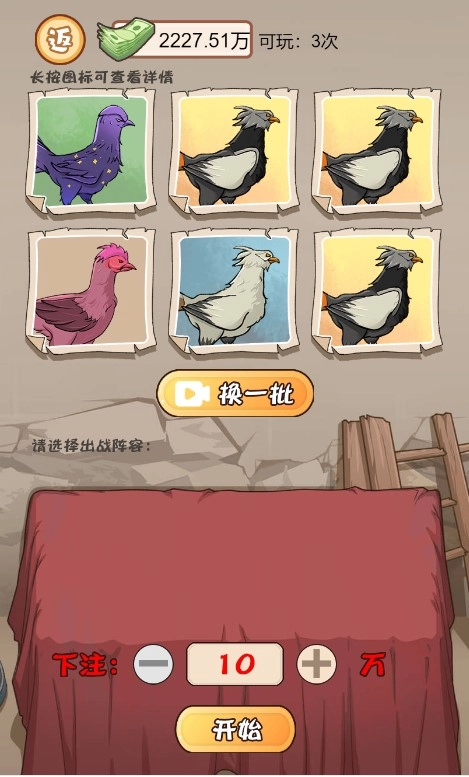 介绍:挑选最具潜力的斗鸡参与比赛,投注金额越高,获胜的概率越大,但相应地,一旦失利损失也会更惨重!长按每只鸡的图标就能查看它的战斗力数值,建议选择综合能力最为出色的鸡战士上场竞技!