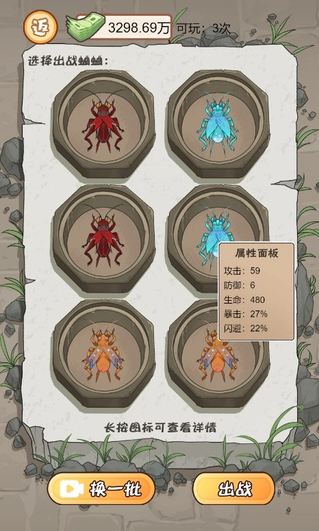 介绍:选择综合实力最强的蛐蛐出战为你赢得胜利吧!