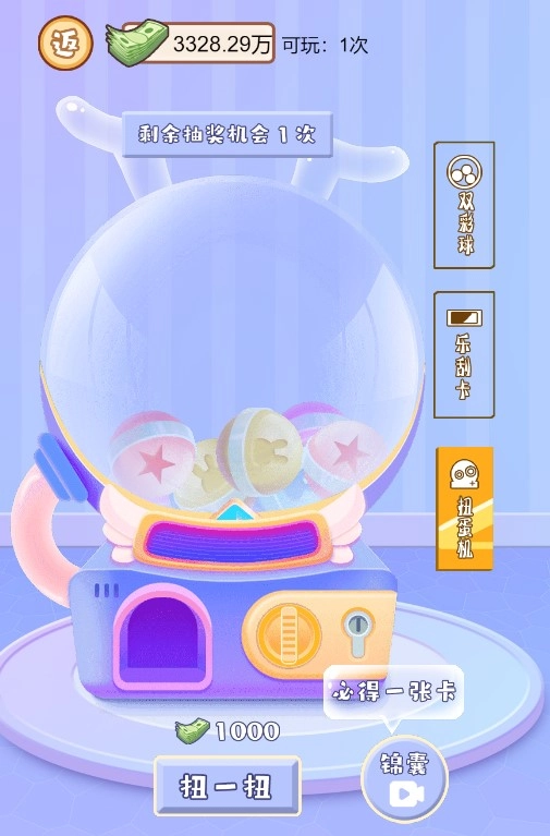 玩法:这是一台平平无奇的扭蛋机,投入硬币后它就会转动,能开出硬币或者特殊卡片。等你把特殊卡片收集齐全,就能获得丰厚的奖励啦!