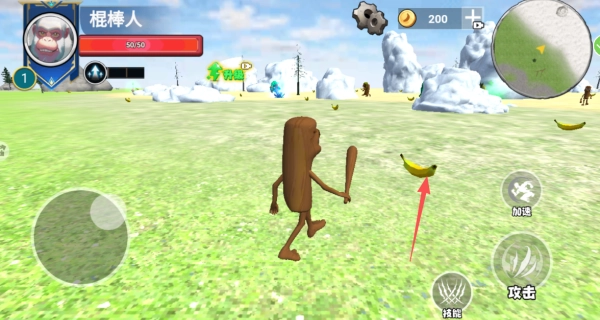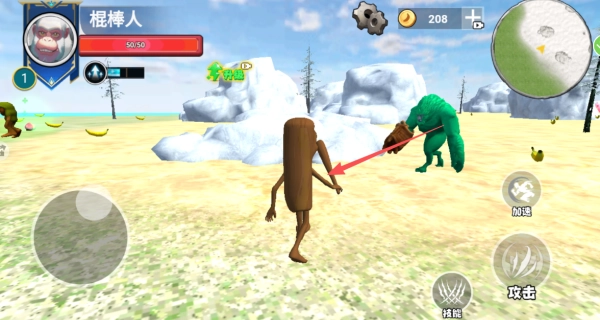1、借助左侧按钮控制木棍人移动,在场景里搜寻并收集能用于升级的资源,为自身成长积蓄基础力量。