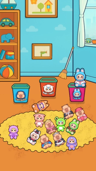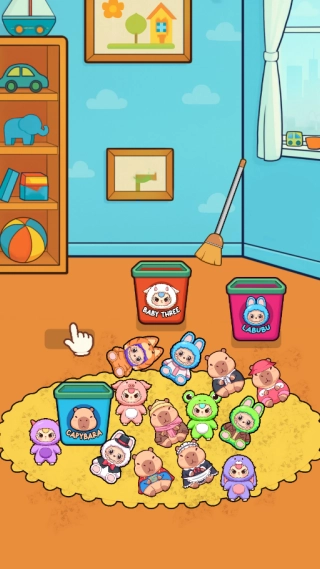 3、在整理关卡里,要先把地毯上的玩偶依据图案分类,放进对应的收纳桶中,之后用扫把清扫污渍,按照分类清扫的顺序逐步推进。