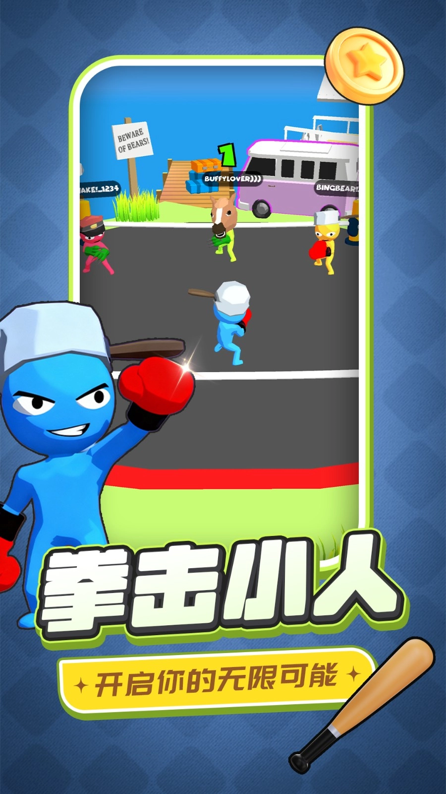 2、控制角色在擂台上移动,主动向其他角色发起攻击,场景中会随机掉落武器,拾取武器后能提升攻击力,更容易击败对手。