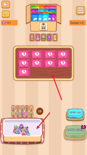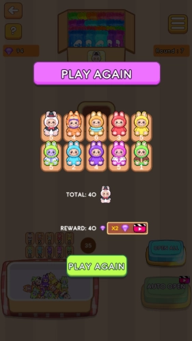 6、进入下一回合后,上方会继续显示可开启的盲盒,此前开到的labubu会存放在左下角。