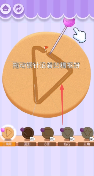 3、玩抠糖饼时,我们得拖动钢针,顺着凹槽来完成抠糖饼的操作。