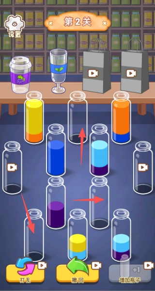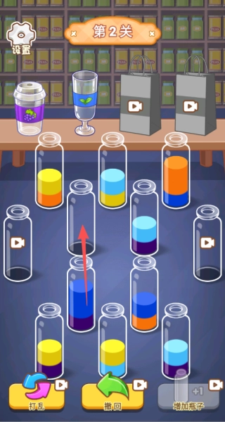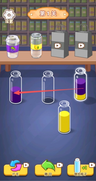 1、先从简单的单层单色液体着手整理,比如优先处理仅含紫色、黄色这类单一颜色的液体,再慢慢过渡到处理多层颜色的瓶子。