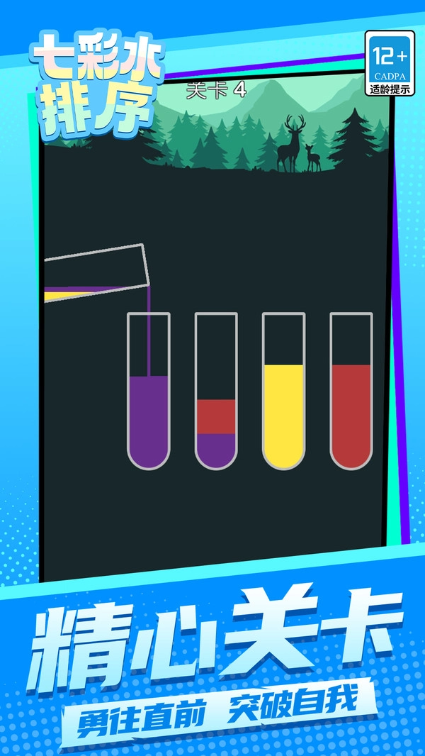 3、加入充满奇思妙想的智力挑战元素,部分特殊关卡需要跳出常规思维模式,通过巧妙规划液体转移的先后顺序方可通关,以此激活思维的活跃度。