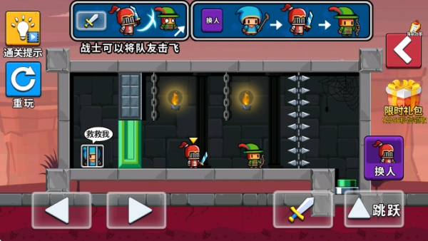 3.进入第一章的首个关卡后,玩家需灵活切换操控勇者和弓箭手这两个角色,只要成功解救被困的法师,就能顺利通关。