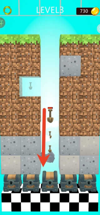 2、操控铲子使其自由下落,精准击中方块以完成消除,并策略性地规划消除的先后顺序。