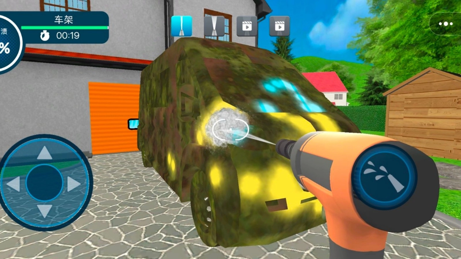 1.玩家第一步需用高压水枪冲洗车身表面的污渍,可通过调节水压大小和水枪角度,来适配不同的污垢严重程度以及车身的各个部位。