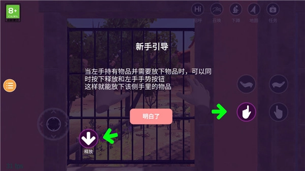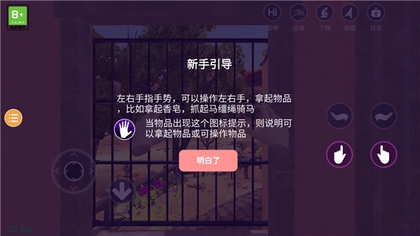 3、手指手势支持精准抓取操作——当目标物品上出现半透明手型图标时,长按手势键就能完成拾取或交互操作。