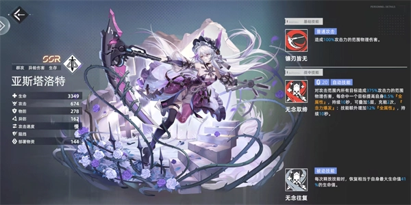 亚斯塔洛特(镰刀妹):普通卡池就能获取,抽到的概率似乎被暗中调整过,大概在40%到50%之间。前期一定要抽,抽到之后游戏体验会有明显提升。只需要专注升级她的2技能,哪怕只培养这一个核心也能达到ACE级别的强度,除了无法对空之外没有其他缺点。