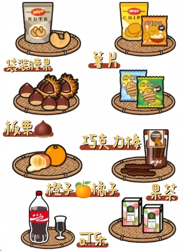 1、柚子、粑粑柑、红枣、花生、瓜子、柿饼、柿子、腰果、开心果、松子、糖莲藕、冬瓜糖、青团。