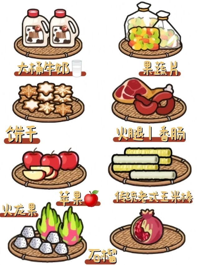 4、大桶牛奶、果蔬脆片、饼干、火腿、香肠、苹果、火龙果、石榴、传统玉米棒。