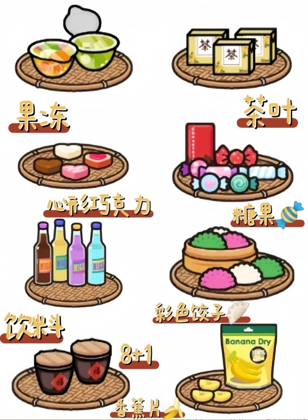5、果冻、糖果、心形巧克力、茶叶、饮料、彩色饺子、香蕉片。