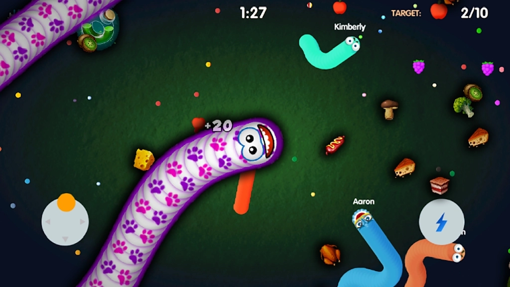 3、操控摇杆控制你的蠕虫移动,不断吞食小光点,努力成为世界上最长的蠕虫!