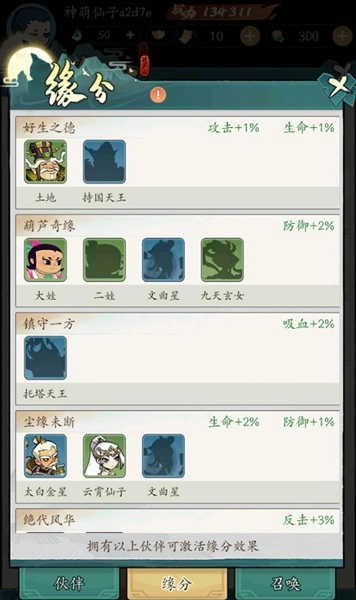 1、集齐特定的伙伴组成组合即可激活缘分,缘分能为道友提供永久的属性加成。