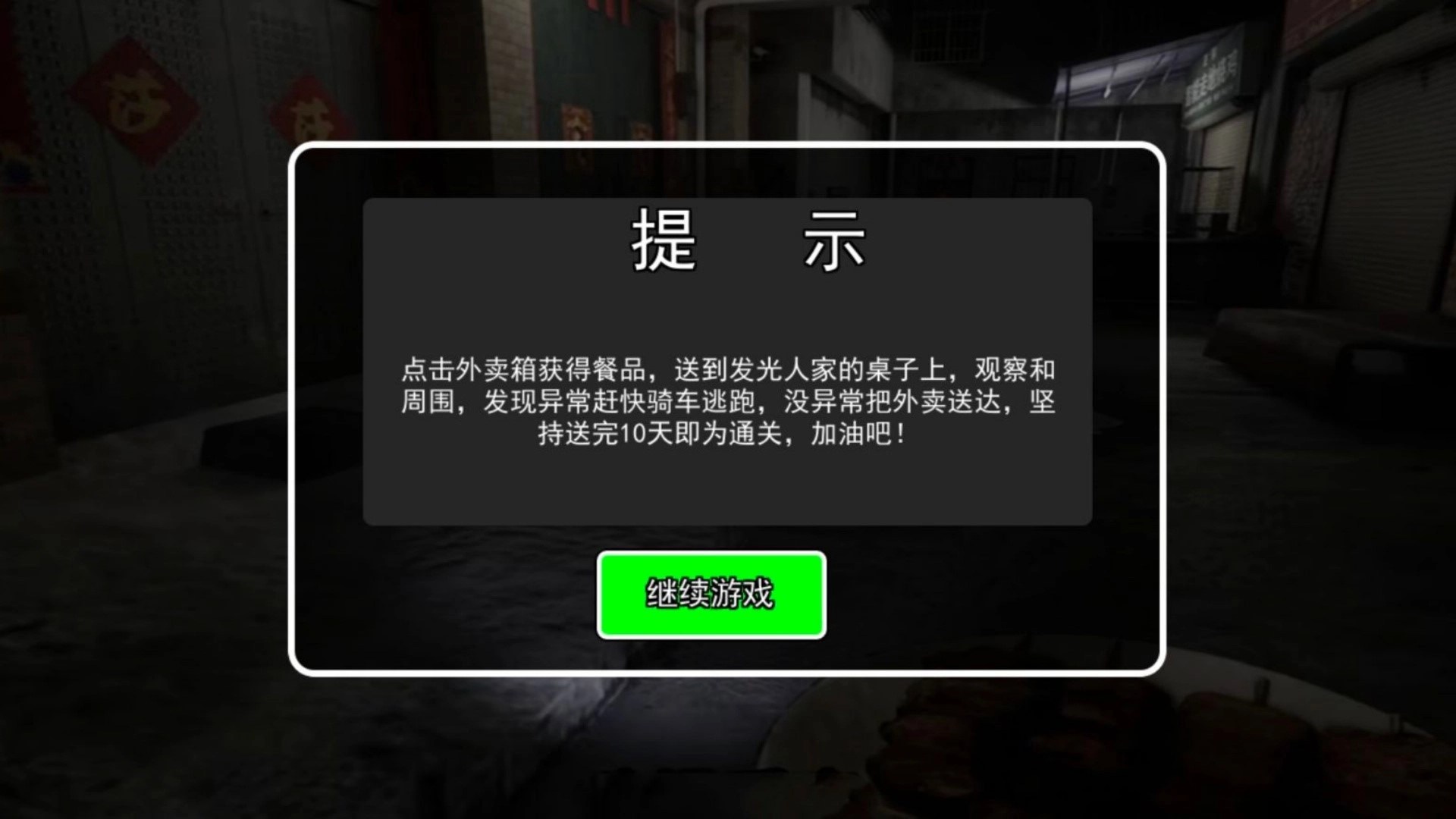4.在这个模式下,玩家要完成为期10天的任务,送外卖的过程中得留意是否有异常情况,一旦发现异常,就得马上骑摩托车快速逃离!