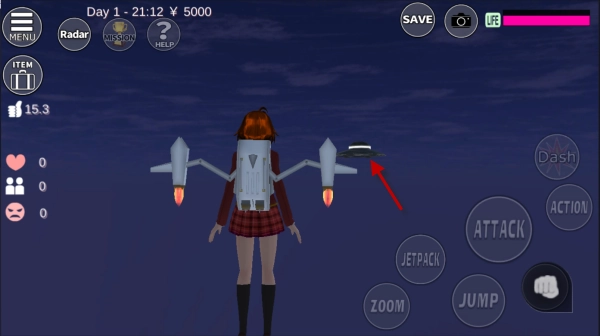 2、接着启动喷漆背包,持续上升到与楼顶高度相近时,就能看到UFO了。